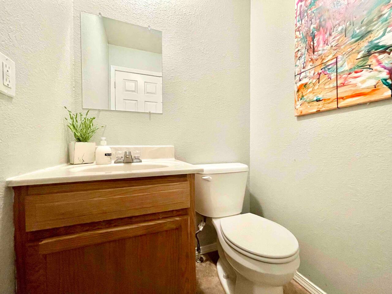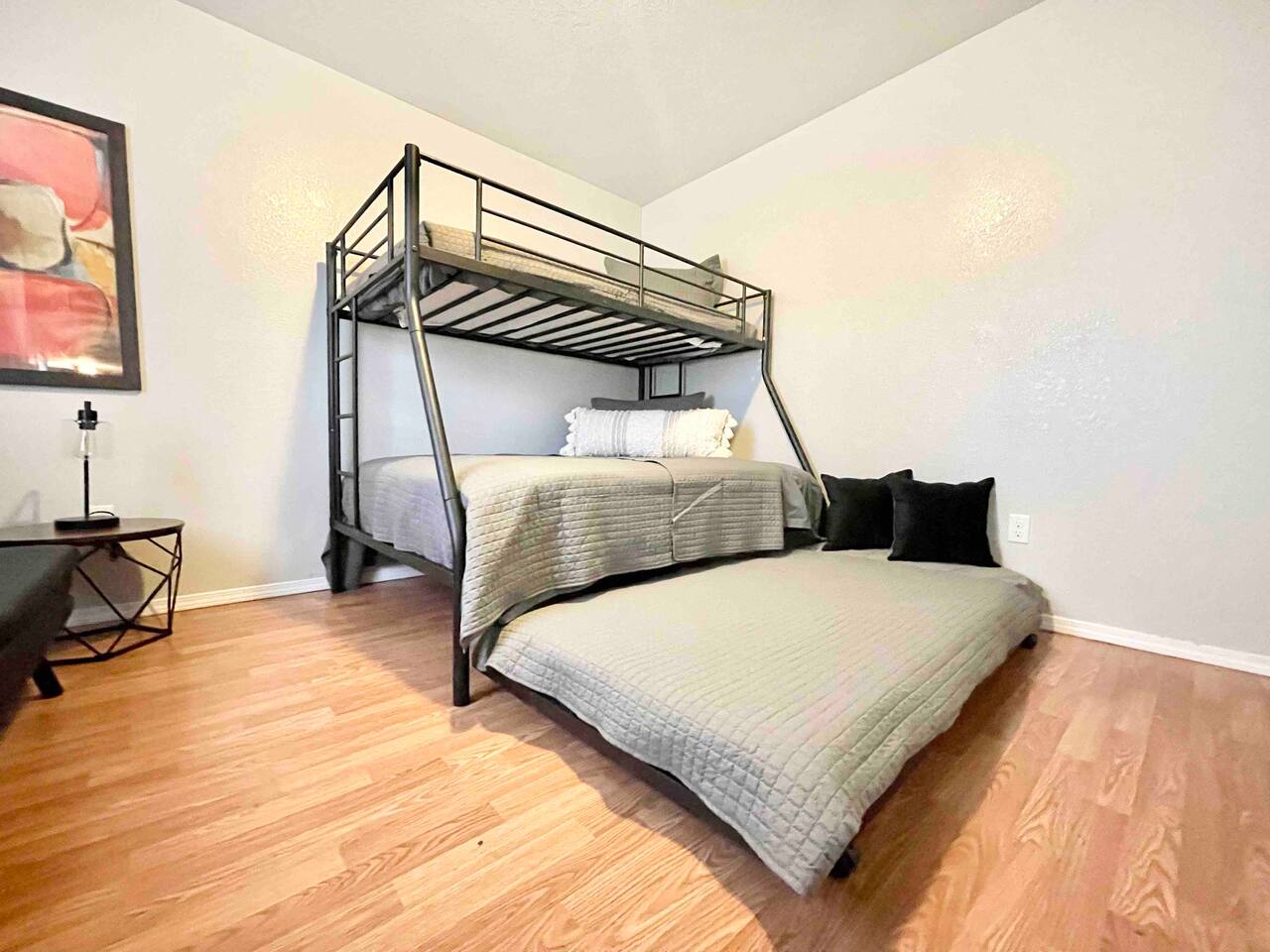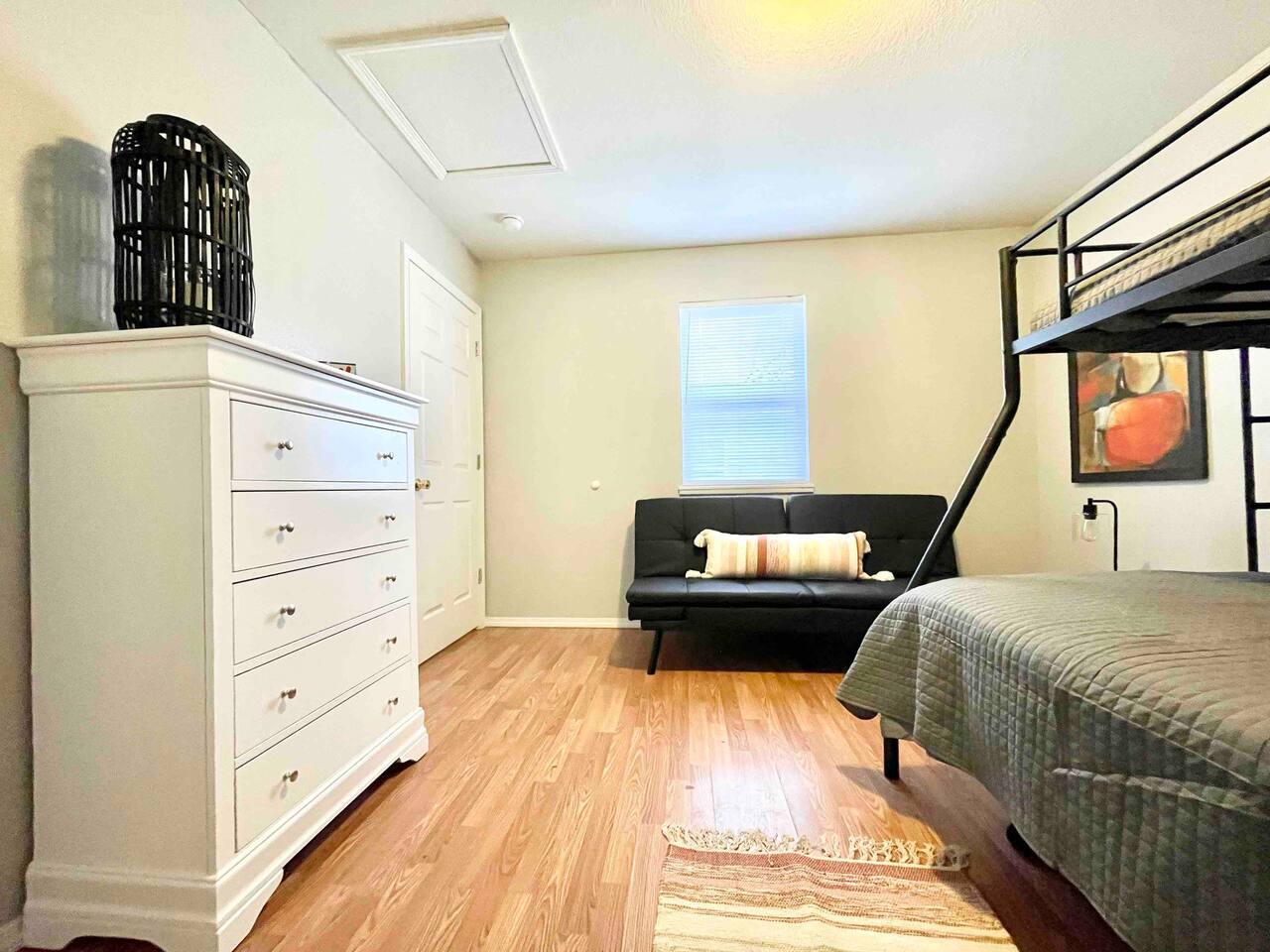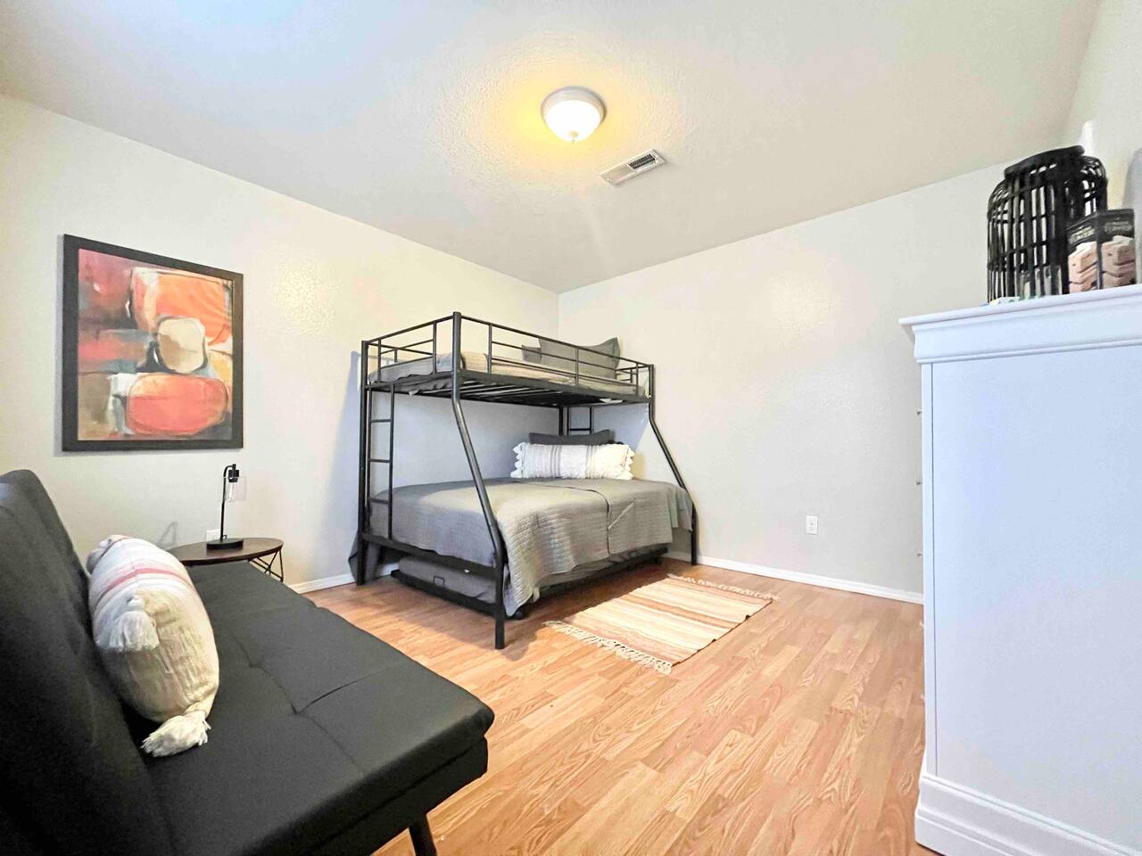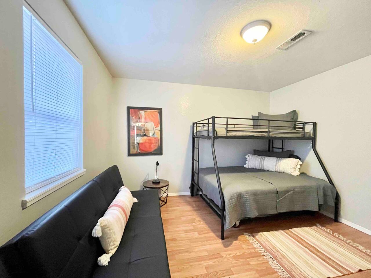 🏡 Quick Snapshot 👨👩👧 Sleeps 8 comfortably – 2 bedrooms + multiple bed options 🛁 1 full bathroom – stocked with toiletries & fresh towels 🐾 Pet-friendly ($25 per night, per pet) 🚶 Walk to downtown shops, dining & attractions ☕ Coffee bar + full kitchen for easy meals 📶 Fast WiFi + desk – perfect for remote work or school 🧺 Washer & dryer – convenient for long stays 🌳 Deck + backyard for relaxing outdoors ⭐Amenities 🛏 Bedrooms & Sleeping Bedroom 1: Queen bed Full/Twin bunk + twin roll-out + sofa bed (Bedroom 2) Fresh linens & towels Clothing storage Bedroom 2: Full/Twin bunk bed, twin roll-out bed, couch that converts into bed (sleeps 4) Fresh linens & towels 🛁 Bathroom Essentials Shower/tub combo Shampoo, conditioner, body wash & shower gel Hair dryer & toiletries Towels, soap & toilet paper 🍳 Kitchen & Dining Fully equipped kitchen with cookware & dishware Coffee bar ☕ (Keurig + drip coffee maker + starter coffee) Refrigerator, freezer, stove, oven & microwave Dishwasher & toaster Baking sheet, pots, pans, barbecue utensils Dining space for the group 🛋 Living & Entertainment Spacious living room with sectional sofa 58” Smart TV (stream your favorite apps) Board games & books for family fun Ceiling fans for comfort 🧺 Laundry & Long Stays Washer & dryer in unit Laundry detergent provided Long-term stays (28+ days) allowed 📶 Connectivity & Workspace Free high-speed WiFi Dedicated desk for remote work or study ❄️ Comfort & Safety Central air conditioning & heating Smoke alarm & carbon monoxide alarm Fire extinguisher & first aid kit 🌳 Outdoor & Parking Private deck with seating Backyard (not fully fenced) Free driveway parking (2 vehicles) Additional free street parking 👨👩👧 Family Friendly High chair for little ones Games & books to keep kids entertained 🐾 Pet Friendly Pets welcome ($25 per night, per pet) Assistance animals always allowed