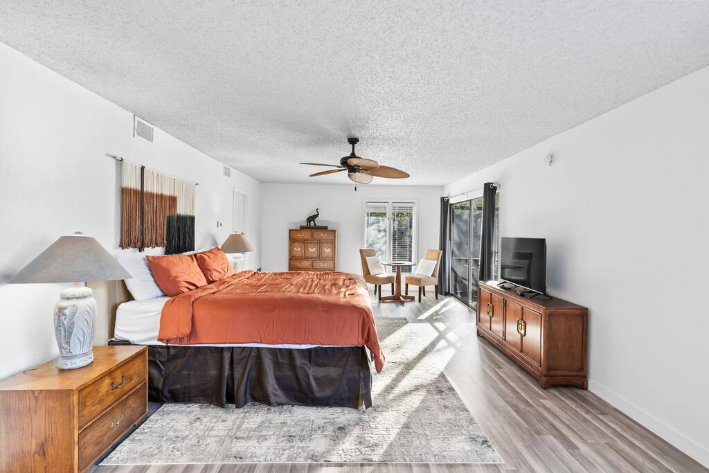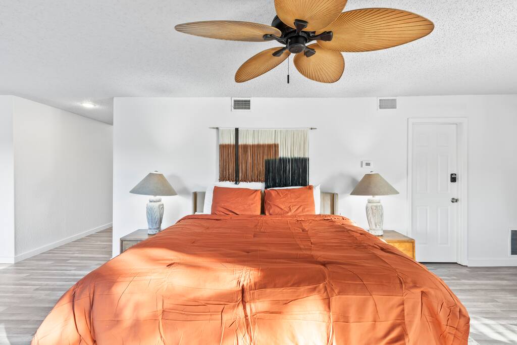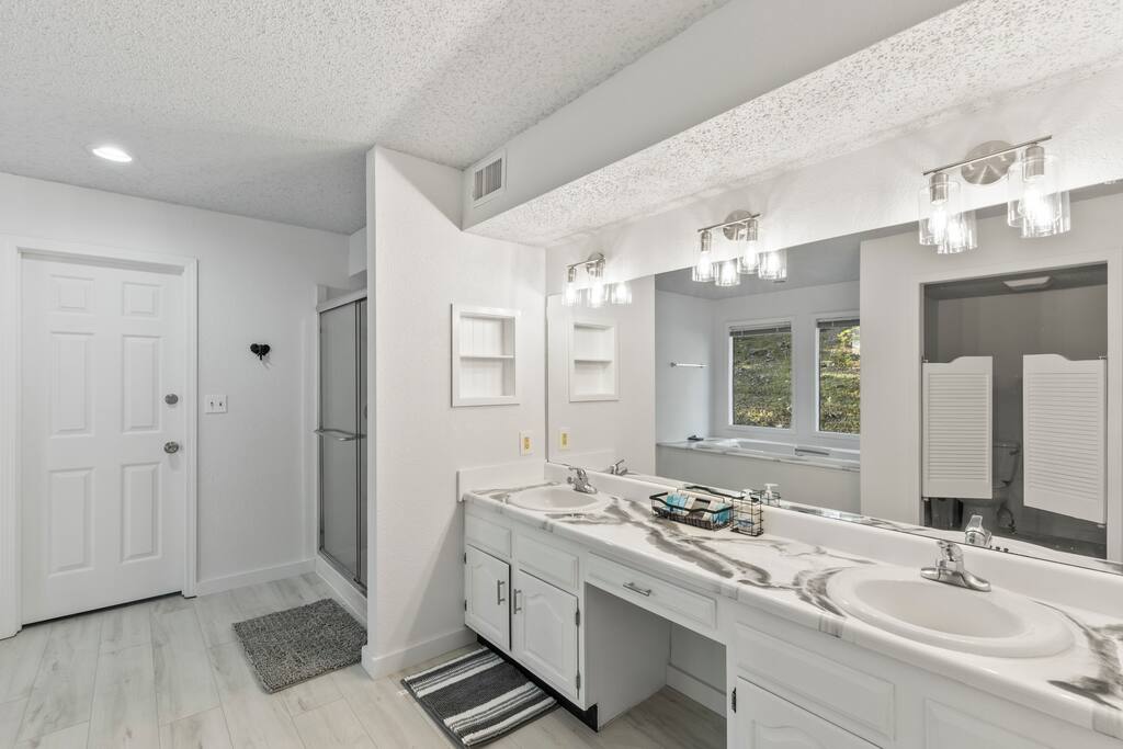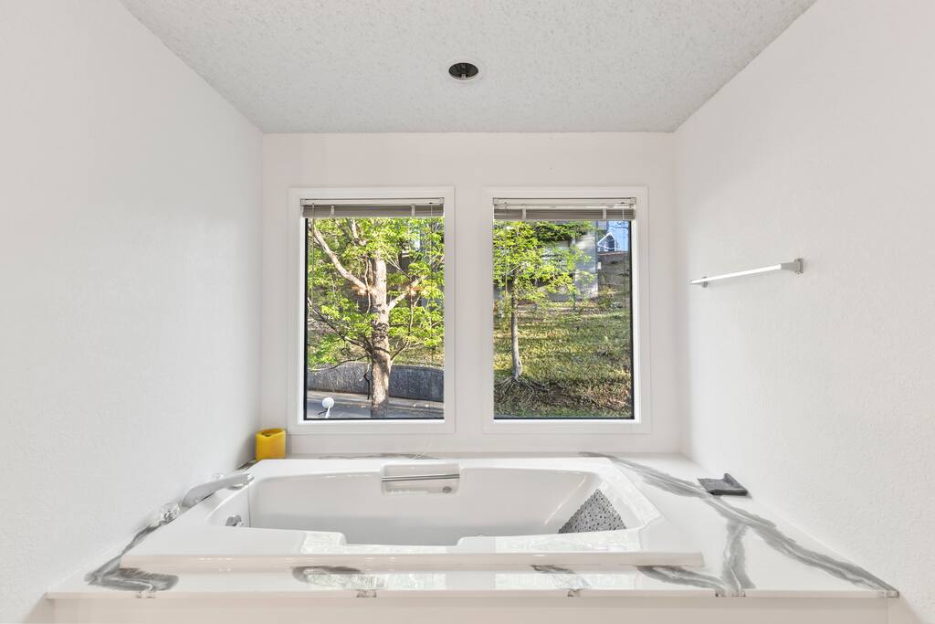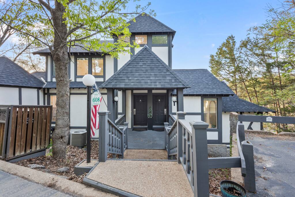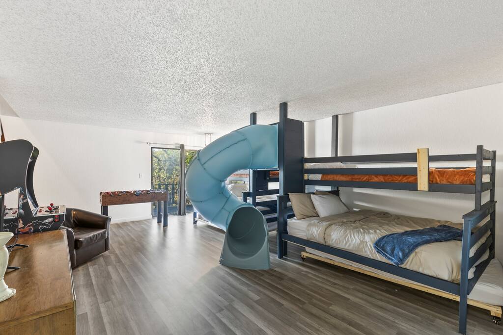 Living Room: Settle into the cozy couch and enjoy a movie night by the fireplace, or gather around the 3-in-1 table for a friendly game of pool, ping-pong, or dinner together. Sliding doors open right onto the deck for fresh air and lake views. Kitchen: Whether you're whipping up a big breakfast or late-night snacks, the kitchen has everything you need—full-size appliances, a coffee maker, and all the cookware and utensils you’d have at home. Deck: Kick back and relax on the spacious deck with plenty of seating, a lounge chair, and a ceiling fan to keep cool—all while soaking in gorgeous views of the lake. Dining Area: Enjoy meals together at the large dining table with seating for eight, surrounded by natural light from big windows you can adjust for privacy or sunlight. Bedroom 1: Rest easy in the king bed, with a private bathroom, TV, and a quiet corner for reading or morning coffee. Step straight onto the deck for fresh air and lake breezes. Bedroom 2 (Kids' Room): The kids will love their own space—complete with bunk beds and a slide, an arcade game, foosball table, TV, and their own full bathroom. Bedroom 3: Perfect for couples or families, this room has two queen beds, a TV, a seating area, private bath, and direct access to the deck for morning views. Bedroom 4: Spacious and relaxing with two queen beds, a TV, comfy couch, and a private bath with a separate vanity—plus walk-out access to the deck. Bedroom 5: This cozy retreat features two queen beds, a TV, two armchairs, a private bathroom, and sliding doors that open straight onto the deck.