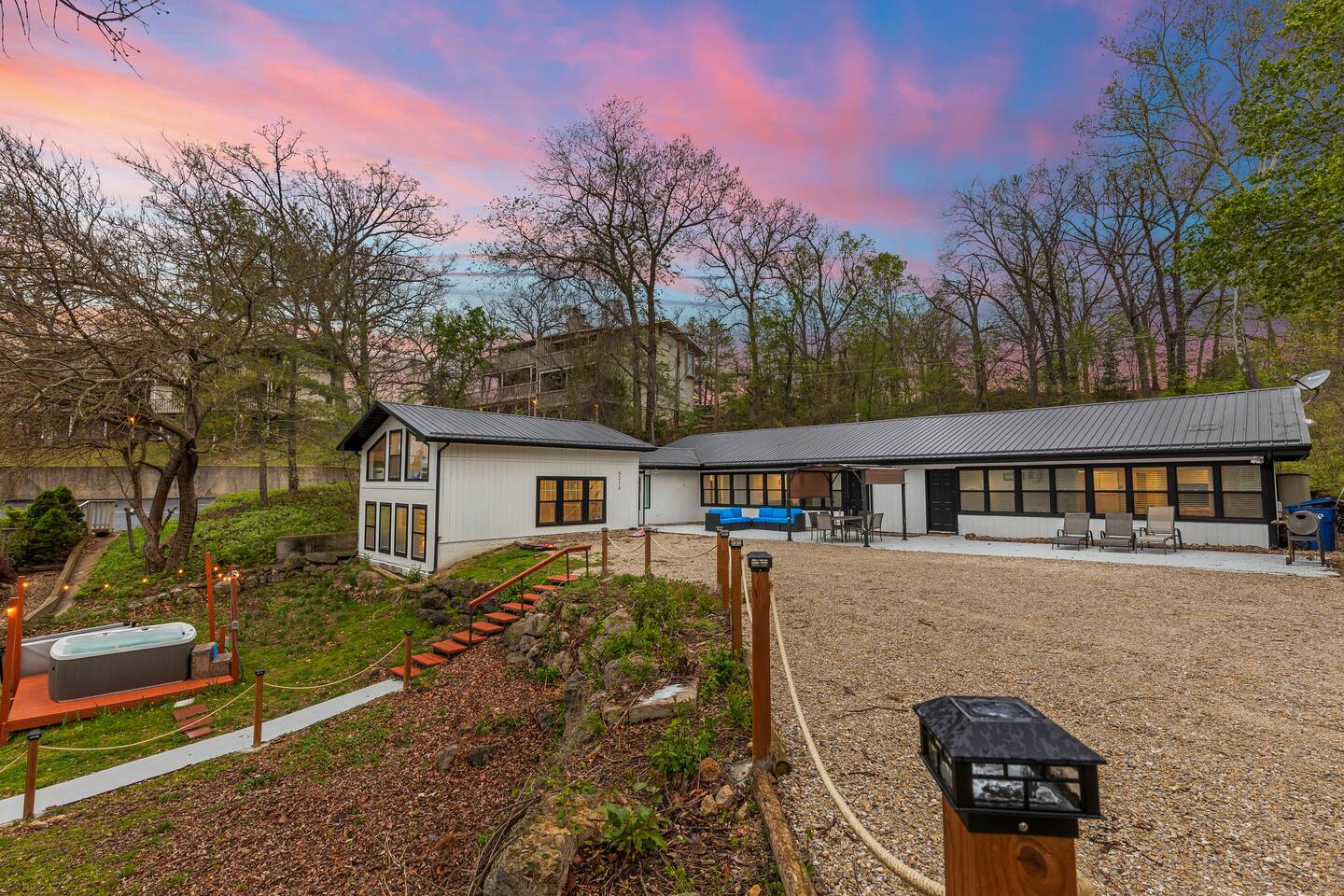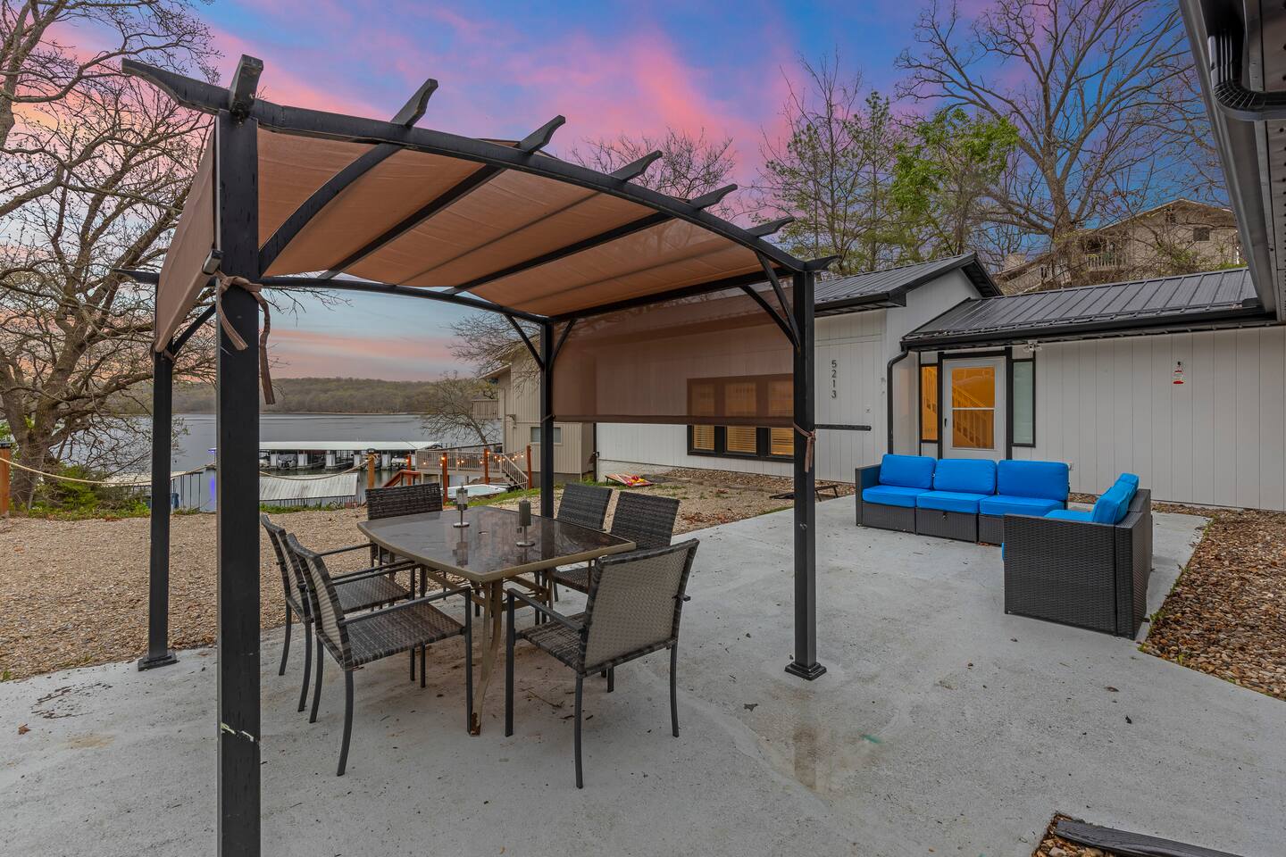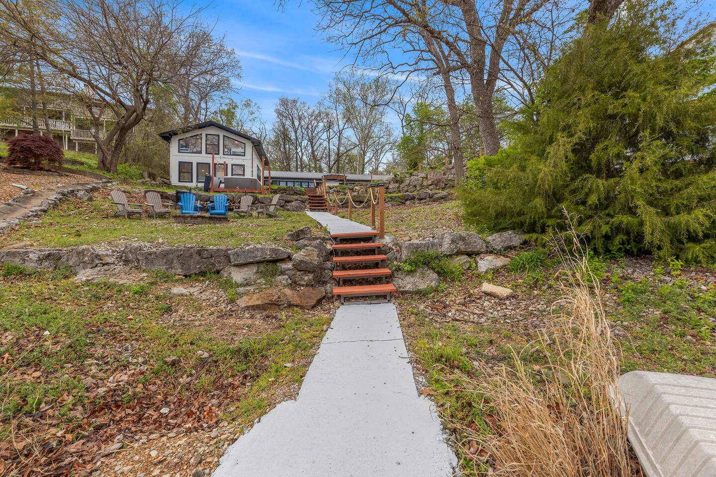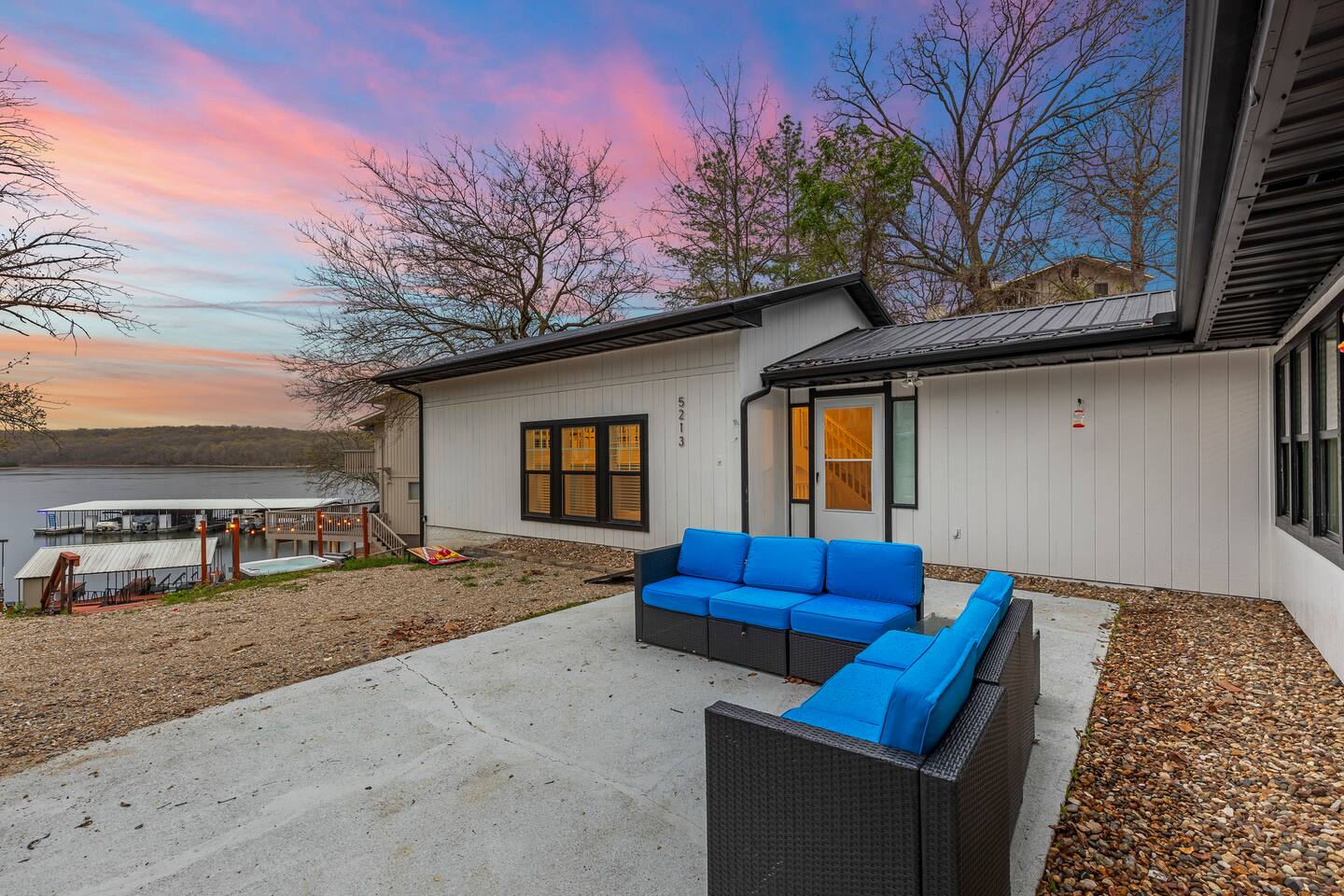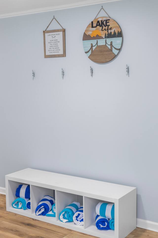 This listing is for the entire property. Welcome to a fabulous lake getaway in this freshly updated waterfront home that can accommodate 23 guests! With a stylish coastal inspired design, soothing blue and white décor, multiple living areas, a hot tub, fire pit, and lovely open floor plan, it's perfect for large group vacations, family reunions, etc. Next to the state park marina, renting a boat is a breeze. Create lifelong memories at this beautiful home base for your next big lake vacation!